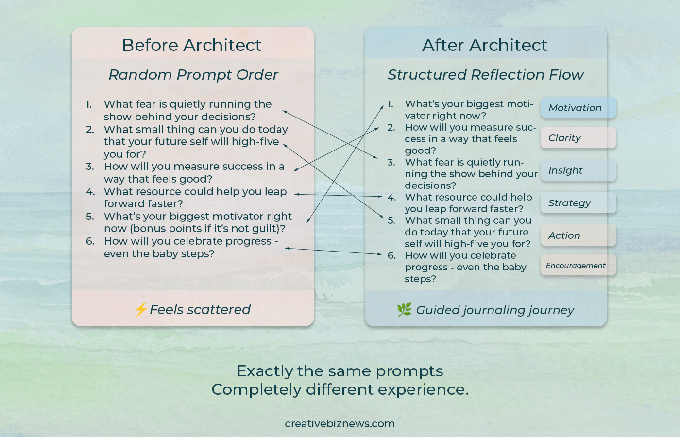 Turn your prompts into coherent, thoughtful journaling journeys your readers will actually finish.